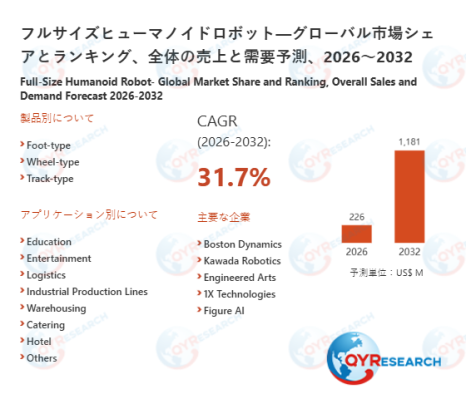 QY Research株式会社(所在地:東京都中央区)は、「フルサイズヒューマノイドロボット―グローバル市場シェアとランキング、全体の売上と需要予測、2026~2032」に関する最新調査レポートを公開しました。本レポートでは、フルサイズヒューマノイドロボットの世界市場を対象に、市場規模、販売数量、価格推移、市場シェア、主要企業の競争ポジションを体系的に整理し、地域別・国別の動向に加えて、製品タイプ別および用途別の詳細セグメント分析を掲載しています。さらに、2021年から2032年までのデータを基に市場の中長期的な成長軌道を検証し、将来的な拡大余地や投資機会を提示するとともに、競争環境の構造変化や企業戦略の方向性、業界が直面する課題についても多面的に考察しています。