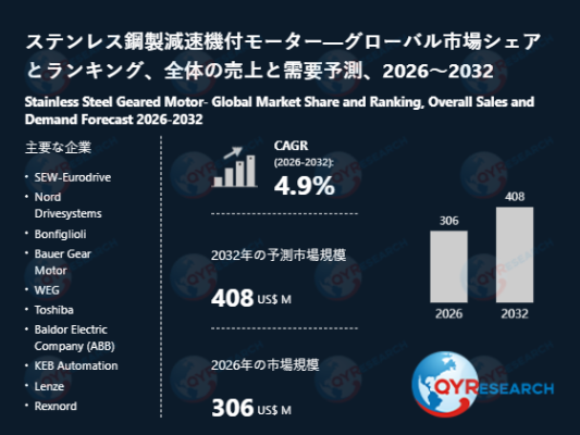 ステンレス鋼製減速機付モーターの世界市場規模は、2025年には約293百万米ドルに達すると推計されています。2026年には306百万米ドル規模へと拡大する見込みであり、その後も安定した成長軌道を維持すると想定されています。2026年から2032年の期間においては、年平均成長率(CAGR)4.9%で推移し、2032年には市場規模が約408百万米ドルに達する見通しです。