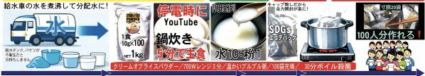 本セットを活用することで、家庭や避難所において、約100人分の災害食を“その場で作る訓練”が可能となります。