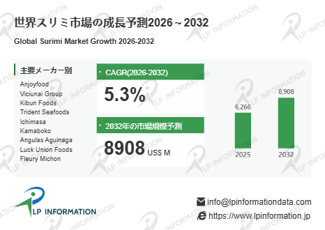 LP Information調査チームの最新レポートである「世界スリミ市場の成長予測2026~2032」(https://www.lpinformation.jp/reports/583108/surimi)によると、2026年から2032年の予測期間中のCAGRが5.3%で、2032年までにグローバルスリミ市場規模は89.08億米ドルに達すると予測されている。ここで読み取れるのは、前半が安定成長の局面であるのに対し、後半は伸び率が一段上がる構造である点である。市場の主戦場は、単一の練り製品カテゴリーの増減ではなく、スリミを基材とした商品設計の多様化と、流通形態の拡張が同時に進む領域へ移っている。価格だけでなく品質規格、歩留まり、食感再現性、配合自由度といった評価軸が強まり、原料であるにもかかわらず価値が説明できる素材へ近づくほど、市場の上振れ余地が大きくなる局面に入っている。