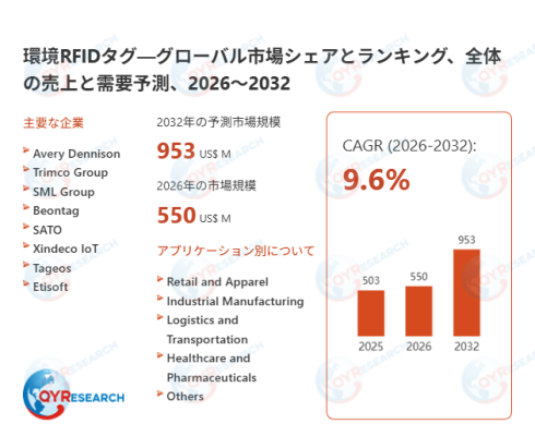 QYResearch調査チームの最新レポート「環境RFIDタグ―グローバル市場シェアとランキング、全体の売上と需要予測、2026~2032」によると、環境RFIDタグの世界市場は、2025年に503百万米ドルと推定され、2026年には550百万米ドルに達すると予測されています。その後、2026年から2032年にかけて年平均成長率(CAGR)9.6%で推移し、2032年には953百万米ドルに拡大すると見込まれています。