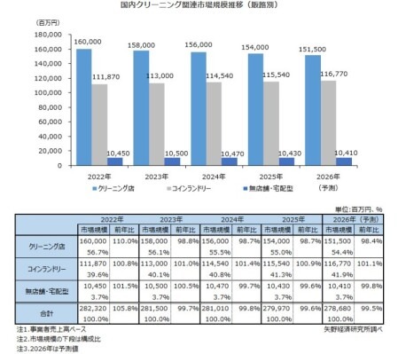 2025年の国内クリーニング関連市場(一般家庭向けのクリーニング店、コインランドリー、無店舗・宅配型のクリーニング店の合算値)は事業者売上高ベースで、前年比99.6%の2,799億7,000万円となり、微減で推移した。