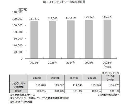 2025年のコインランドリー市場規模は事業者売上高ベースで、前年比100.9%の1,155億4,000万円と推計した。