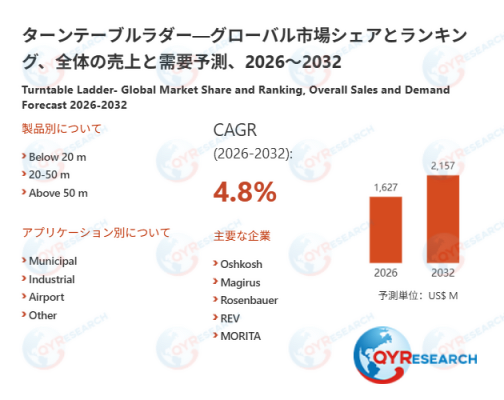 QYResearch調査チームの最新レポート「ターンテーブルラダー―グローバル市場シェアとランキング、全体の売上と需要予測、2026~2032」によると、ターンテーブルラダーの世界市場は、2025年に1551百万米ドルと推定され、2026年には1627百万米ドルに達すると予測されています。その後、2026年から2032年にかけて年平均成長率(CAGR)4.8%で推移し、2032年には2157百万米ドルに拡大すると見込まれています。