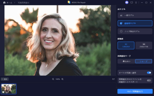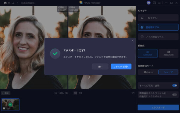 手順3.AIモデルを選択し、解像度を調整した後、「今すぐ高画質化」ボタンをクリックすると、ソフトウェアが高画質化を開始します。高画質化処理が完了したら、プレビューで元の写真と高画質化された写真を比較します。