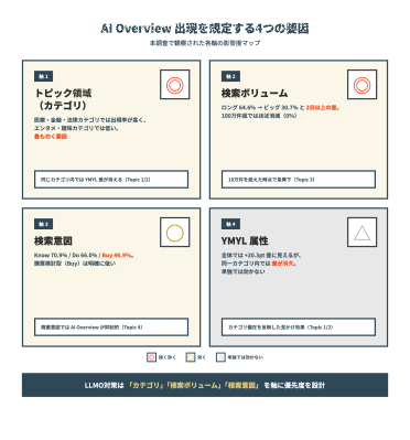 1.AI Overview出現を左右する主要因は「トピック領域(カテゴリ)」である可能性 - 同一カテゴリ内ではYMYL差が観察されず、検索ボリューム階層では出現率が2倍以上の差を示しました。