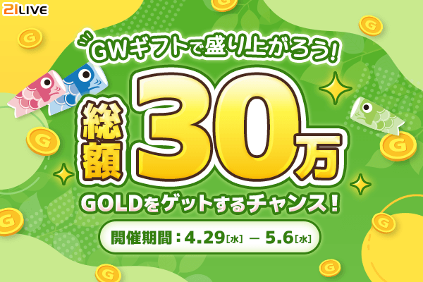 21LIVEでは、4月29日(水)から5月6日(水)の期間、『GWギフトで盛り上がろう!総額30万GOLDをゲットするチャンス!』を開催します。