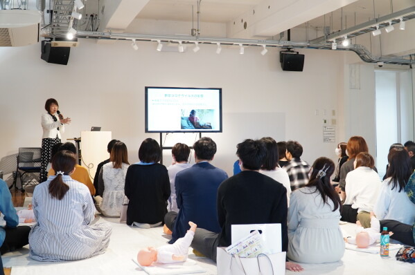 一般社団法人ボディセンス・インスティテュート代表理事の高橋由紀が登壇。産前産後の心身を整えるセルフケアや、赤ちゃんの健やかな発達を促す抱き方・遊び方を実践形式で伝えました。