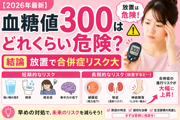 血糖値が300mg/dLという数値を見て、「どれくらい危険なのか」「すぐ病院に行くべきなのか」と不安に感じる方は非常に多いです。結論から言うと、血糖値300は明らかな高血糖状態であり、短期的にも長期的にもリスクが高く、放置すると合併症の進行や急性症状につながる可能性があります。