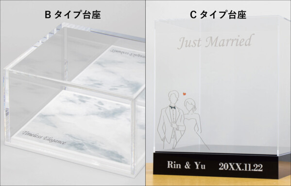 ケース本体に加え、台座の前面・上面への印刷にも対応。上面に大理石や芝生などのテクスチャを印刷して上質感を演出、前面にネームプレートのように名前や日付、メッセージを添える事で展示物と合わせて大切な方へのギフトにお勧めです。用途に合わせて2タイプ(Bタイプ/Cタイプ)の台座を用意しており、オプションで上面をミラー仕様も選択できます。
