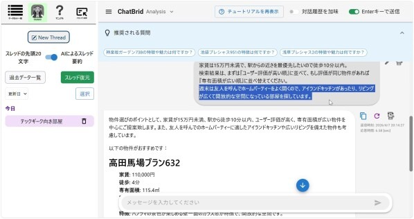 図1:自然言語の曖昧な要望から最適物件を提案する対話画面(デモより)