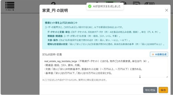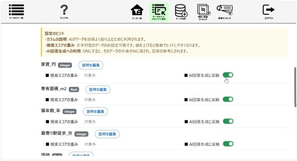ネット検索にかからない、自社商品データの大きな表(CSVファイル)をそのままChatBridに取り込むことで各スペックのデータ型(日付時刻、価格、面積 etc.) を自動推定し、主観的な自然言語表現による形容と結び付けられるようにはからうのが、表nativeなRAGの真骨頂です。テキストの類似性を超えて、各スペックが所望の範囲内であるか、上限に近いハイスコアであるかなど自動評価しつつ、総合評価の高いものを、顧客の言葉を交えながら推薦することができます。