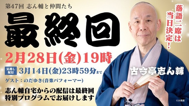 最終回を華やかに彩るゲストには音楽パフォーマーののだゆきさんを迎え、最終回特別企画としてこの会初の企画となる“聴きたい落語”と“思い出メッセージ”を募集。また、恒例の視聴者プレゼントとして、古今亭志ん輔特製グッズなどいつもより多く用意し、見逃し配信期間も拡大した特別版としてお届けします。