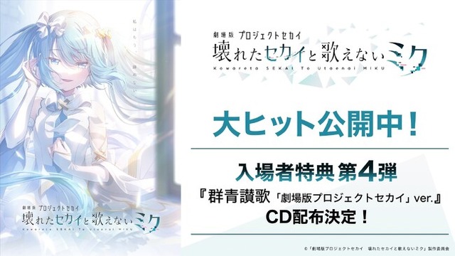 株式会社セガ(本社:東京都品川区、代表取締役 社長執行役員COO:内海州史)と株式会社Colorful Palette(本社:東京都渋谷区、代表取締役社長:近藤裕一郎)は、iOS/Android向けリズム&アドベンチャー『プロジェクトセカイ カラフルステージ! feat. 初音ミク(以下、プロジェクトセカイ)』について、アニメ映画『劇場版プロジェクトセカイ 壊れたセカイと歌えないミク』の週替わり入場者特典第4弾として、5ユニット全メンバー20人が歌唱した『群青讃歌「劇場版プロジェクトセカイ」ver.』(作詞・作曲:Eve、編曲:raku(tayori))のCD配布が決定したことをお知らせいたします。また、劇場版本編で登場する、多くのクリエイターの方たちの楽曲情報を一挙公開いたしました。