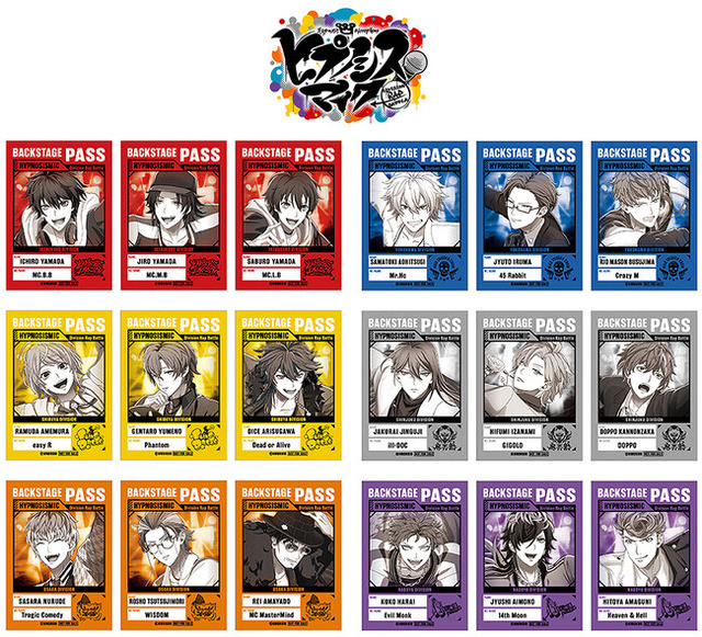 開催内容:期間中『ヒプノシスマイク -Division Rap Battle-』関連のキャラクターグッズをご購入・ご予約内金1,100円(税込)毎、または書籍・CD・Blu-ray・DVDをご購入・ご予約(内金1,100円〈税込〉以上必須)1点毎に、特典「バックステージパス風カード(全18種)」を1枚プレゼントいたします。