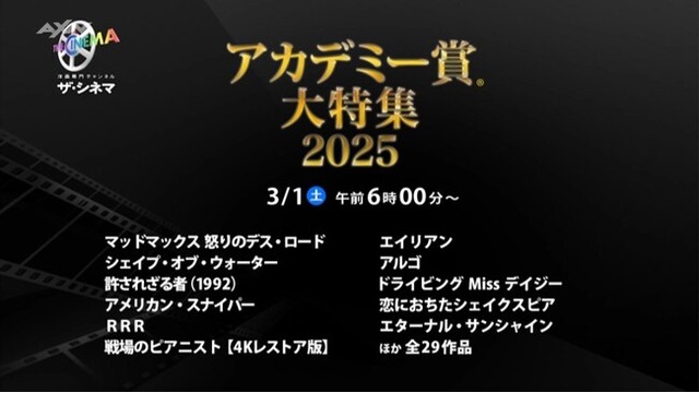 洋画専門チャンネルザ・シネマ(AXN株式会社、本社:東京都渋谷区、代表取締役社長 大園天樹)は、映画界最大の祭典!アカデミー賞の歴史に名を刻む数々の名作を集めた「アカデミー賞大特集2025」を放送いたします。3月1日(土)~3月26日(水)の期間に異才ジョージ・ミラー監督が30年ぶりにシリーズを復活させた爆走アクション『マッドマックス 怒りのデス・ロード』、シェイクスピアの情熱的な恋を描く歴史ロマンス『恋におちたシェイクスピア』など全29作品をお届けいたします。