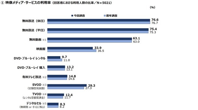 映像メディア利用率は、「映画館」「DVD・ブルーレイ レンタル」が減少、「SVOD」が増加