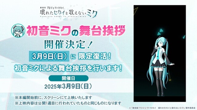 株式会社セガ(本社:東京都品川区、代表取締役 社長執行役員COO:内海州史)と株式会社Colorful Palette(本社:東京都渋谷区、代表取締役社長:近藤裕一郎)は、iOS/Android向けリズム&アドベンチャー『プロジェクトセカイ カラフルステージ! feat. 初音ミク(以下、プロジェクトセカイ)』について、公開初週限定で上映していた初音ミクによる舞台挨拶を、2025年3月9日(日)に1日限定で上映することをお知らせいたします。