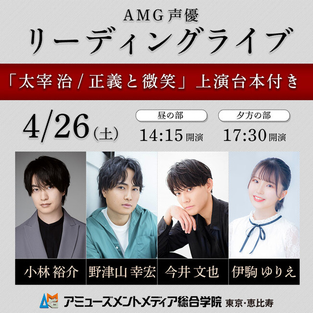 AMG 声優リーディングライブ「太宰治/ 正義と微笑」が2025年4月26日 (土)に一ツ橋ホール(東京都千代田区一ツ橋2-6-2)にて上演されます。出演には小林裕介、野津山幸宏、伊駒ゆりえのほか、今井文也と小田敏充(アミューズメントメディア総合学院講師)が決定しました。
