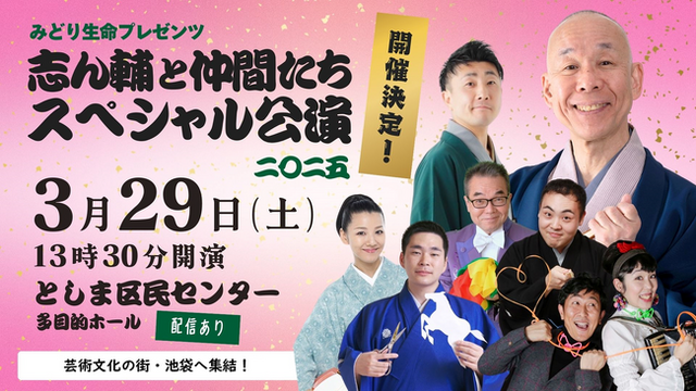 毎日新聞社と毎日企画サービスは3月29日(土)午後1時半から、「みどり生命プレゼンツ『志ん輔と仲間たち』スペシャル公演2025」を、としま区民センター(豊島区東池袋)で開催します。
