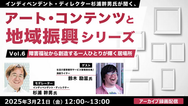 【アーカイブ録画配信】インディペンデント・ディレクター杉浦幹男氏が聞く、アート・コンテンツと地域振興シリーズvol.6障害福祉から創造する一人ひとりが輝く居場所