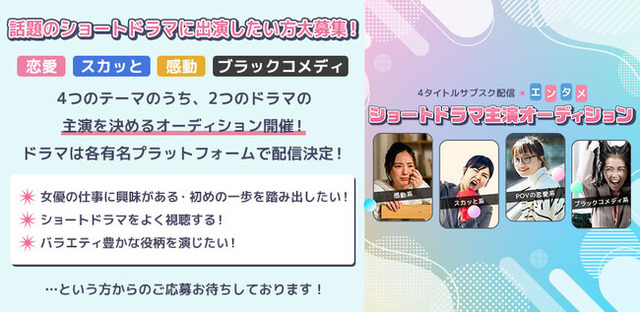 ※”4タイトルサブスク配信エンタメショートドラマ主演オーディション”というイベントにご応募ください。