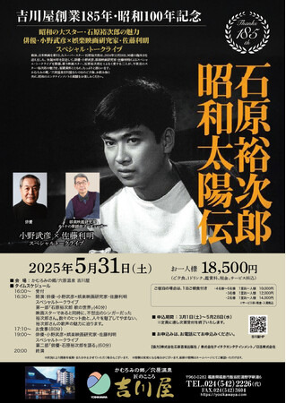 かむろみの郷/穴原温泉 匠のこころ 吉川屋(福島市飯坂町湯野字新湯6/代表取締役社長 畠 正樹)では、2025年5月31日(土)に、お料理をお楽しみいただきながら、石原裕次郎の歌の世界、俳優・石原裕次郎の魅力を豊富な映像資料とともにお送りする「小野武彦×佐藤利明 スペシャルトークライブ」を開催します。
