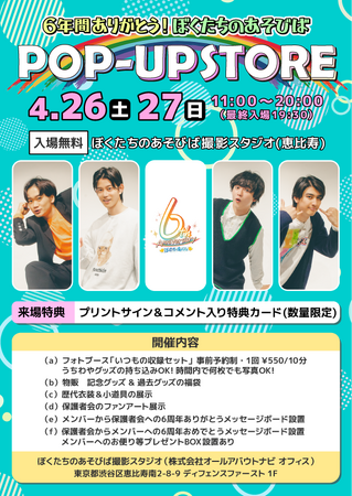 「6年間ありがとう!ぼくたちのあそびばPOP-UP STORE」は、“保護者会”(※)に感謝を込めて、東京・恵比寿にて2025年4月26日(土)、27日(日)の2日間限定で開催します。会場には「いつもの収録セット」での写真撮影コーナーや、記念グッズなどの販売を行います。また、歴代衣装の展示や保護者会のファンアート展示、メンバーから保護者会への6周年ありがとうメッセージボードなどの展示も行います。