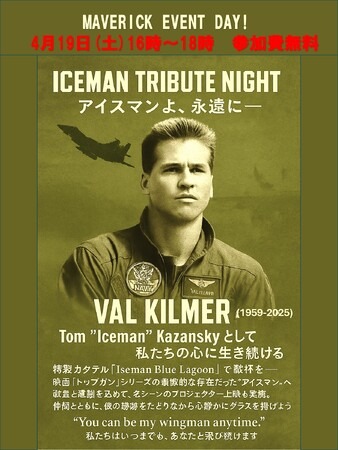 映画の中でアイスマンがマーヴェリックに残した魂の言葉「Who’s the better pilot?」に涙したファンも多いはず。今回のイベントでは、アイスマンの名場面を大型プロジェクターで上映し、彼をイメージしたカクテル「ICEMAN's Blue Lagoon」での献杯を行います。