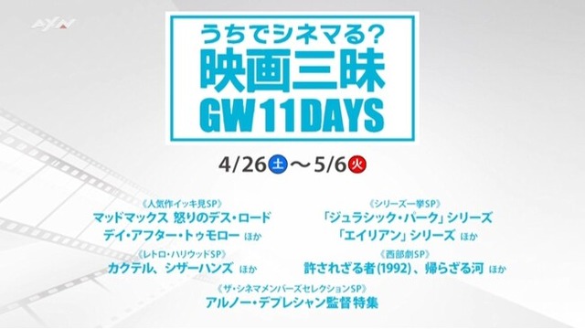 洋画専門チャンネルザ・シネマ(AXN株式会社、本社:東京都渋谷区、代表取締役社長 大園天樹)では、4月26(土)~5月6日(休・火)のゴールデンウィークの11日間は、おうちで映画を楽しもう!コロナ以前のような大型連休に戻ってきた中、たっぷり映画を楽しんで頂くために、ザ・シネマではGW特別編成を実施!大ヒット作、懐かしの作品、西部劇からシリーズものまで様々な企画を毎日お届け!