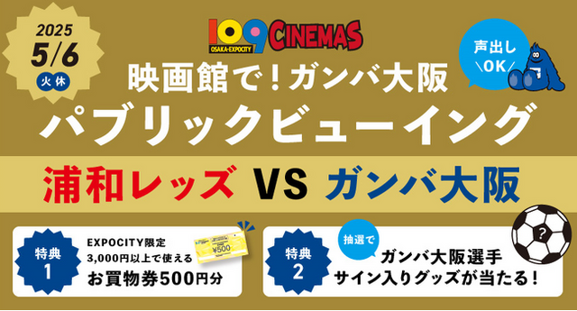 明治安田J1リーグ第15節 浦和レッズ戦のパブリックビューイングを109シネマズ大阪エキスポシティで開催いたします。入場チケット1,000円(税込)をご購入いただくと、入場者全員にEXPOCITY限定3,000円以上で使えるお買物・お食事券500円分と、さらに抽選でガンバ大阪選手サイン入りグッズが当たります。劇場売店でご購入された飲食物は、上映中にお召し上がりいただけます。声出しもOKな迫力満点の映画館で、みんなでガンバ大阪へ声援を送りましょう!◆日時・場所