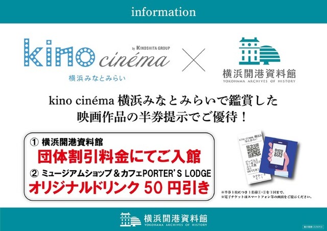 「kino cinema横浜みなとみらい」で鑑賞した映画の半券の提示で、当館の入館料等が割引になる優待サービスを、また当館に来館された方が、所定のチラシを「kino cinema横浜みなとみらい」にお持ちになり、映画鑑賞されますと、ミニポップコーンまたはドリンク1杯をご提供いたします。
