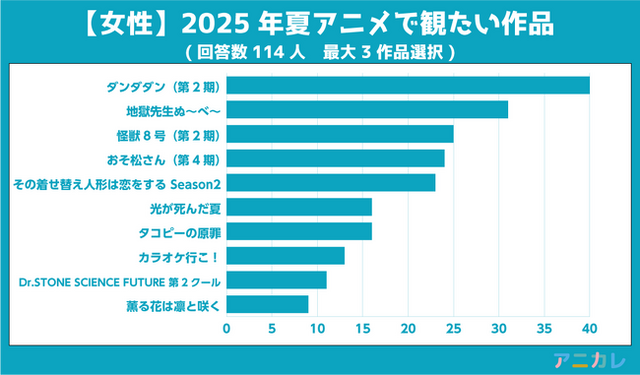 調査方法:インターネット調査、2025年夏アニメより観たい作品を1人最大3作品選択調査機関:自社調査