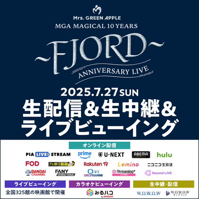 ユニバーサル ミュージック合同会社(本社:東京都渋谷区、 社長兼最高経営責任者(CEO):藤倉尚 / 以下、 ユニバーサル ミュージック)は、Mrs. GREEN APPLEが神奈川県・山下ふ頭にて7月27日(日)に開催するライブ『MGA MAGICAL 10 YEARS ANNIVERSARY LIVE ~FJORD~』(読み:フィヨルド)の公演配信プラットフォーム、カラオケビューイングの視聴チケットを6月28日(土)昼12:00より販売開始します。