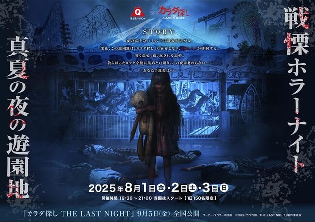 今年は映画「カラダ探しTHE LAST NIGHT」の舞台になっている、“夜の遊園地”が園内に再現されます。参加者は通常立ち入りができないバックヤードや、営業終了後のアトラクションを巡り、映画さながらの「バラバラのカラダを探し集めるミッション」に挑戦します。イベント中は映画で登場する全身が血で染まった少女『赤い人』がどこからともなく挑戦者たちに襲いかかり、まさに映画の世界に飛び込んだようなイマーシブ体験をお届けいたします。また、今年8月より開催される「アウトドアシアターイベント」のこけら落としとして、特別映像やキャストによるメッセージムービーを屋外スクリーンで放映いたします。ここでしか見ることができない、スペシャルコンテンツにもぜひご注目ください。