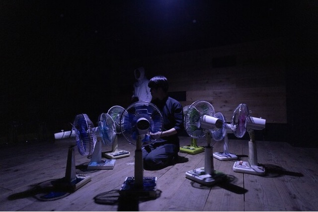 メインパフォーマーの岡本晃樹は、抽象性の高いジャグリング道具(ボールやリング)と、日常物(扇風機・カメラ)を同じモードで扱います。その中で、「身体」そのものがモノと化す瞬間すら描かれます。現実と虚構、実体と映像が交錯し、「これはどこまでが何か?」を問い直す空間が出現します。
