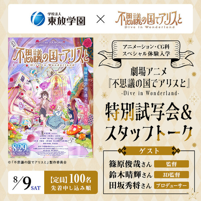 東放学園映画アニメCG専門学校(所在地:東京都新宿区、校長:蒲田 直樹)のオープンキャンパスでは、劇場アニメ『不思議の国でアリスと -Dive in Wonderland-』(2025年8月29日全国公開/配給 松竹)の特別試写会&スタッフトークイベントを8月9日(土)に開催します。
