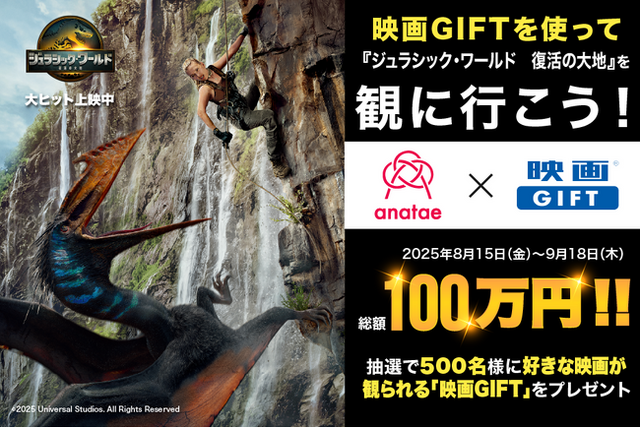 体験ギフト・マーケットプレイス「anatae(あなたへ)」を運営するANATAE株式会社(本社:東京都目黒区、代表取締役:堀田栄利康)は、株式会社ムービーウォーカー(本社:東京都千代田区、代表取締役社長:五十嵐淳之)と共催し、2025年8月15日(金)から9月18日(木)まで、抽選で映画GIFTが当たるプレゼントキャンペーンを開催します。