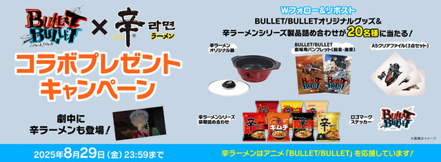 株式会社農心ジャパン(本社:東京都千代田区、代表取締役社長:金大廈)の展開する「辛ラーメン」は、アニメ『BULLET/BULLET』とコラボレーションしたXキャンペーンを8月20日(水)~8月29日(金)に開催します。同作品は、今夏公開の新作アニメで、今世界各国で最も注目を集めるアニメーション監督の一人、朴性厚監督・原案の超ゴキゲンなノンストップ・アクション作品。劇中には辛ラーメンも登場します。キャンペーン期間中、Xでご応募いただいた方の中から抽選で20名様にBULLET/BULLET・辛ラーメンオリジナルグッズをはじめとした豪華賞品をプレゼントします。
