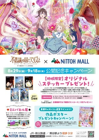 双日商業開発株式会社(本社:東京都中央区/代表取締役社長:柏木 広喜)が運営するJR錦糸町駅前の複合商業施設「オリナス錦糸町」(東京都墨田区太平)およびJR熊谷駅前の大型商業施設「ニットーモール熊谷」(埼玉県熊谷市銀座)の2館において、2025年8月29日(金)から上映される劇場アニメ「不思議の国でアリスと -Dive in Wonderland-」の公開を記念し、地域限定映画オリジナルステッカープレゼント企画や、豪華キャスト直筆サイン入り映画ポスターが抽選で当たるキャンペーンを開催いたします。
