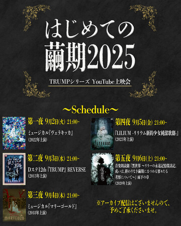 今回は、Dステ版『TRUMP』REVERSE、ミュージカル『マリーゴールド』、『黒世界 雨下の章』、ミュージカル『ヴェラキッカ』、『LILIUM -リリウム新約少女純潔歌劇-』の公開を予定しており、『ヴェラキッカ』、『LILIUM -リリウム新約少女純潔歌劇-』は初のYouTube公開となる。