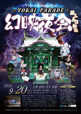 株式会社Sakura Rin(本社:大阪府、代表取締役:徳永 勝里)は、動画生成AI「Vidu」と共同で、生成AIを活用した妖怪映像上映イベント 「Yokai Parade ~幻映夜会~」 を2025年9月20日(土)19時~21時、東京都練馬区・春日神社にて開催いたします。(参加費無料 / 雨天の場合は、翌日21日の同時刻へ順延)