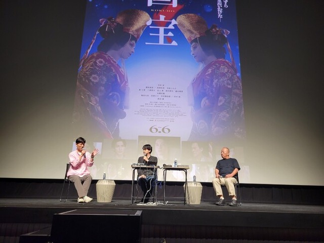 今回のトークショー付き上映は、109シネマズプレミアム新宿のシアター7にて開催。『国宝』本編の上映が終わると、まずは李監督が登壇。「坂本龍一氏が音響監修をした音の良い環境だから、せっかくなので音に関わったプロフェッショナルの方をお呼びして、制作秘話を」との李監督の呼び込みで、原摩利彦さん、白取貢さんが壇上へ。李監督と原さんは、今回が二度目のタッグです。李監督と白取さんとは、『フラガール』や『悪人』など、数多くの作品でタッグを組んできました。