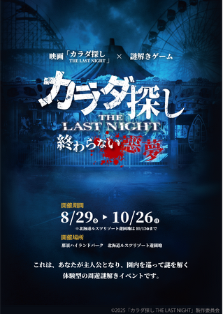 「たのしい」を世界中に届けるエンターテインメント・キャピタルの株式会社オリグレス(本社:東京都品川区、代表取締役社長:吉武 優)は、ワーナー ブラザース ジャパン合同会社が配給する映画『カラダ探し THE LAST NIGHT』の公開を記念し、体験型謎解きイベントを主催・プロデュースいたします。映画と同じく“遊園地”を舞台にした本イベントは、那須ハイランドパーク(栃木県)とルスツリゾート遊園地(北海道)の2施設で開催されます。