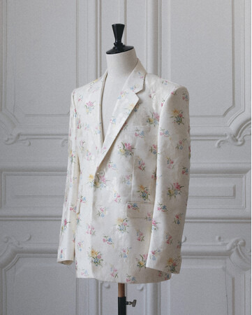 ルカ・グァダニーノは、フィルクーペの花柄モチーフをあしらったホワイトのシルクのシングルブレストノッチドラペルジャケットと、ホワイトのコットンシャツ、ブラックのウールパンツ、ブラックレザーのダービーシューズを着用しました。