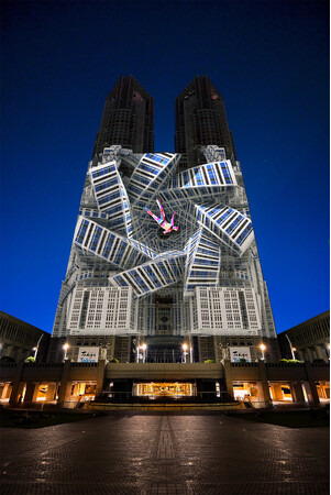 都庁舎は、その膨大なエネルギーを映し出す光と音の共鳴装置となり、街の過去・現在・未来をひとつのビートに束ねて放つ。