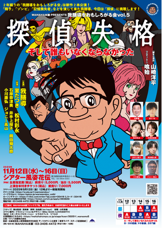 WAHAHA本舗株式会社主催、我膳導をおもしろがる会vol.5『探偵失格』<そして誰もいなくならなかった> /< Xの悲劇、Yの喜劇、Zの?劇>が2025年11月12日 (水) ~ 2025年11月16日 (日)にシアター風姿花伝(東京都 新宿区 中落合 2-1-10)にて上演されます。 チケットはカンフェティ(運営:ロングランプランニング株式会社、東京都新宿区、代表取締役:榑松 大剛)にて発売中です。