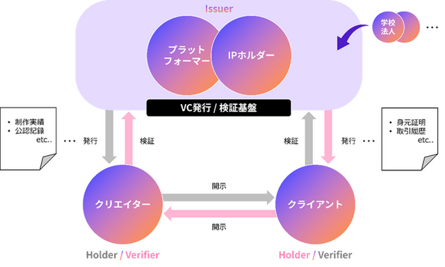 初期段階では、ビジュアルボイスの主催する国際短編映画祭「ショートショート フィルムフェスティバル & アジア (SSFF & ASIA)」の受賞者やノミネート者を対象に受賞・ノミネート履歴を証明書(VC)として発行します。さらに、クリエイターの大学や専門学校等の卒業証明書や、作品を購入するバイヤーの過去の取引履歴を証明書(VC)として発行します。
