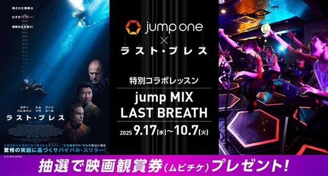 全国に700店舗以上のホットヨガスタジオLAVA等を運営する株式会社LAVA International(本社:東京都港区/代表取締役:鷲見貴彦/以下:LAVA)は、日本初の暗闇トランポリン専門スタジオ「jump one(ジャンプワン)」にて、映画『ラスト・ブレス』(9月26日全国ロードショー)の公開を記念した特別コラボレッスン『jump MIX LAST BREATH(ジャンプミックス ラストブレス)』を2025年9月17日(水)~10月7日(火)の期間限定で開催いたします。