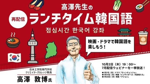 株式会社クリーク・アンド・リバー社(C&R社)は2025年10月2日(木)、今年7月に開催した韓国語を学ぶオンラインセミナーシリーズ「高澤先生のランチタイム韓国語 映画・ドラマで韓国語を楽しもう!」を再配信します(オンライン・無料)。